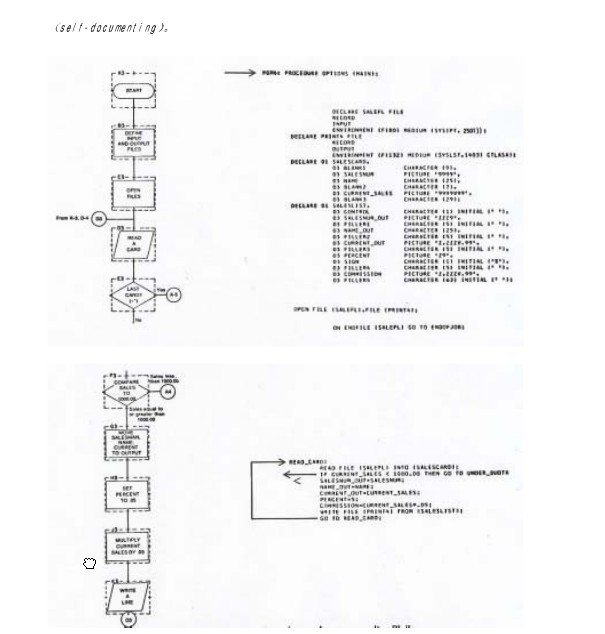 现在看来,在程序中包括流程图显然是一种笨拙(但不是不可以)的做法。考虑到流程图方法的落后和高级语言的使用占统治地位,把程序和文档放在一起显然是很合理的。
